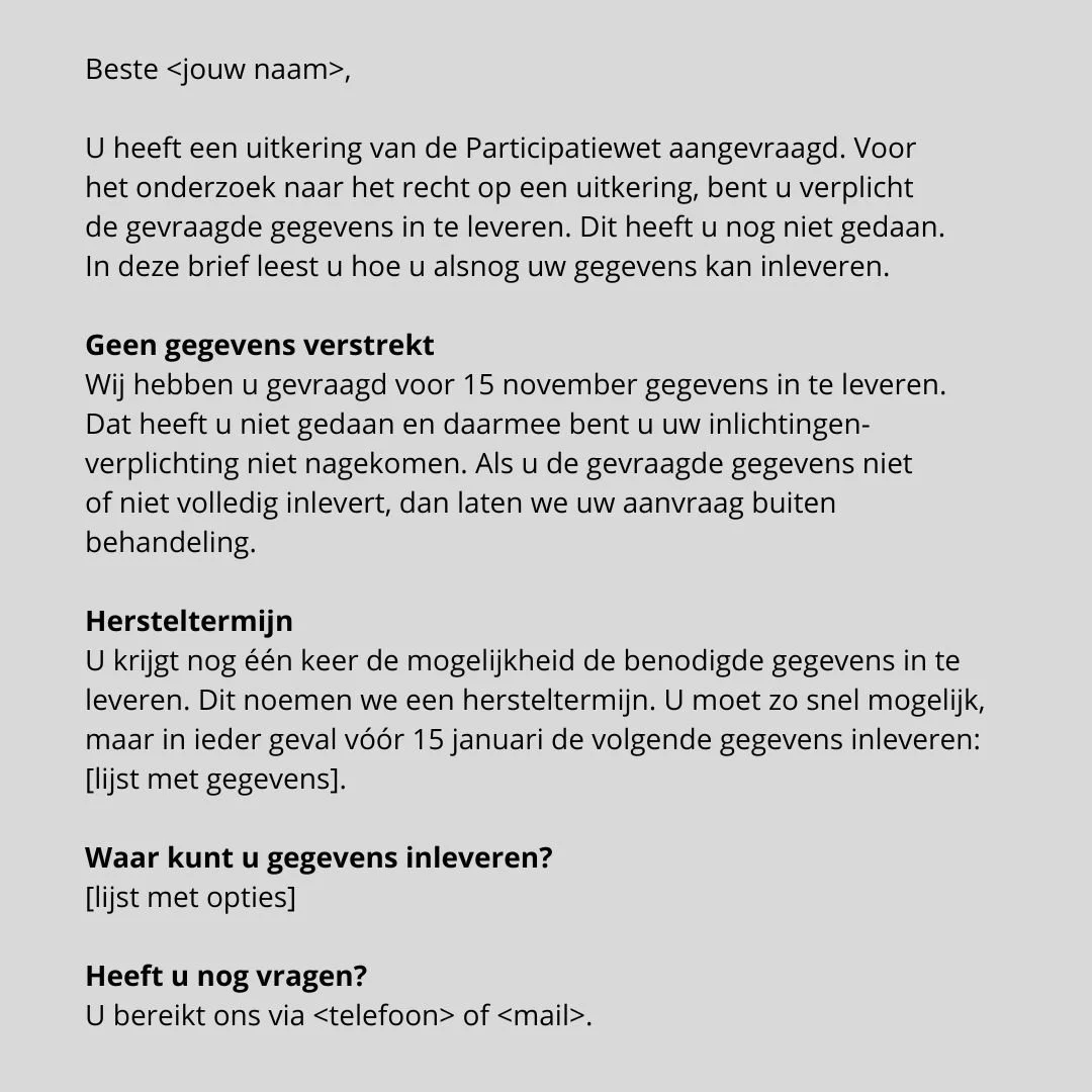 Deze hersteltermijn-brief van mijn deelnemer is een klassiek voorbeeld van hoe het er vaak aan toegaat. Lees deze brief maar eens alsof je de inwoner bent. Hoe komt de boodschap op je over?
